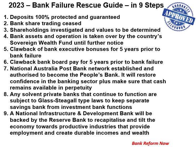 The number one reform requires us to realise that basic banking is really a critical utility. BRN refers to the reform required as a Sovereign Monetary System. A savings bank is a relatively simple operation that is not really that profitable. Governments have allowed the banks to profit from credit creation as well as complex and opaque investment banking which should be totally separated from the banks’ core business that is provided to the vast majority of savings and loans customers. Banks are really using their customers’ funds to generate income for their shareholders and upper-level executives. In other words, the aim of the game is not to serve their customers – it is to exploit them. When the bankers’ gambles and manipulations turn sour, they expect to be bailed out by governments, taxpayers and customers. The classic moral hazard scenario – see below regarding nine critical steps to protect depositors and the country when a bank failure threatens.