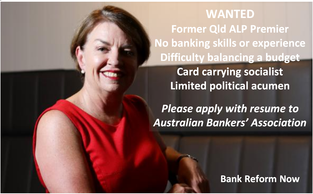Anna Bligh is now the head of the Australian Bankers’ Association. This tells us all we need to know about how politics works in Australia. Do not expect any politician - particularly one from the big two - to work in your interests .... or even the country's interests. Is there anyone - or any group - that will help drain the swamp in Canberra?
