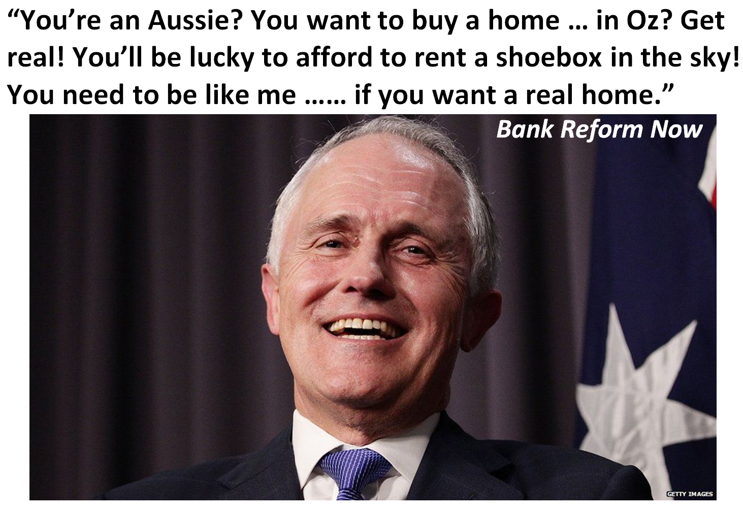 Is it supposed to be a tool for speculative gains in wealth - open to suspect players from right around the world - or is it supposed to provide shelter and security for Aussies? Once we understand this we can put in place the appropriate policies and wear the decline in prices. That sounds harsh doesn’t it? Someone pays $800,000 for a unit in Sydney - and bang!! After the crash it is worth maybe $600,000. How should we manage this? BRN can be pretty cheeky sometimes ...... you know how in the old days the peasants were supposed to bail out the bankers? Well now that we’ve wised up we simply turn the tables. Reforms we are pursuing will lead to the banks bailing out the people.