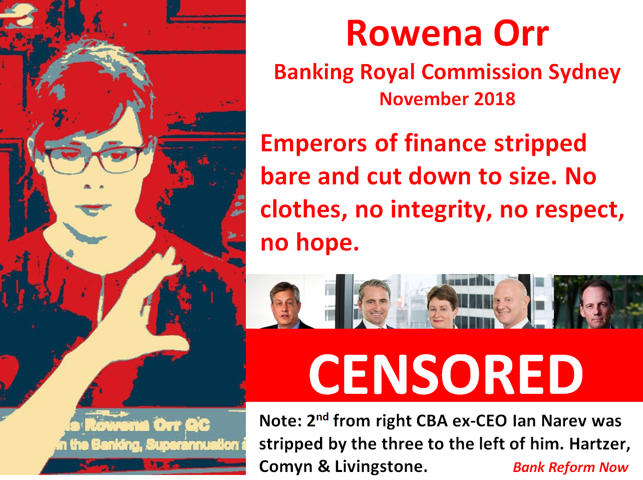 BRN and the merry bank warriors came to Sydney for Round 7 of the Hayne Banking Royal Commission. CBA, Westpac and ASIC were in the dock. QC Rowena Orr stripped the Emperors of finance bare. It was painful. How do these characters even think they deserve to be paid multi million dollar salaries?