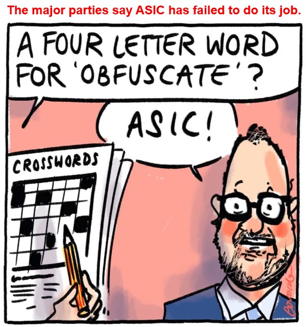 Yet another Senate inquiry into ASIC has been running this year. We believe ASIC has failed in its role. A corporate watchdog that hasn't got teeth will never do the job required. Corporate crimes will only diminish when perpetrators face serious consequences and punishments for their crimes & misconduct. ASIC should be subject to significant reform or axed. Corporate crooks need to know that their victims will be properly compensated and their ill-gotten gains will be confiscated as they are being placed in a jail cell.