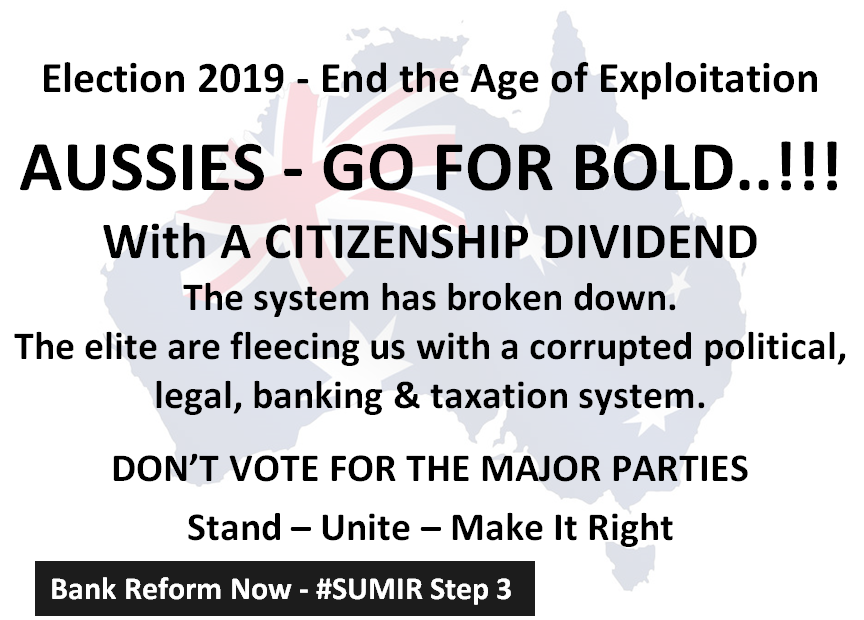 These ideas are not new - BRN has just put them together in an innovative way. South Africa had a Truth & Reconciliation Commission after apartheid fell. Australia used to have a Sovereign bank - the Commonwealth Bank. That bank was to fund the Snowy Hydro scheme – debt free with Sovereign money till political machinations interfered. Also – many nations have built prosperity with Sovereign wealth funds – Singapore, Norway, oil rich Middle East nations. The SUMIR program would enable Australia to do all that and more. With Sovereign Money and Sovereign Wealth our nation should be able to afford the Triphasic Citizenship Dividend …. All possible if people look outside of the box and free themselves from the status quo that binds most people with paper chains, unsustainable debt and unreasonable taxes.
